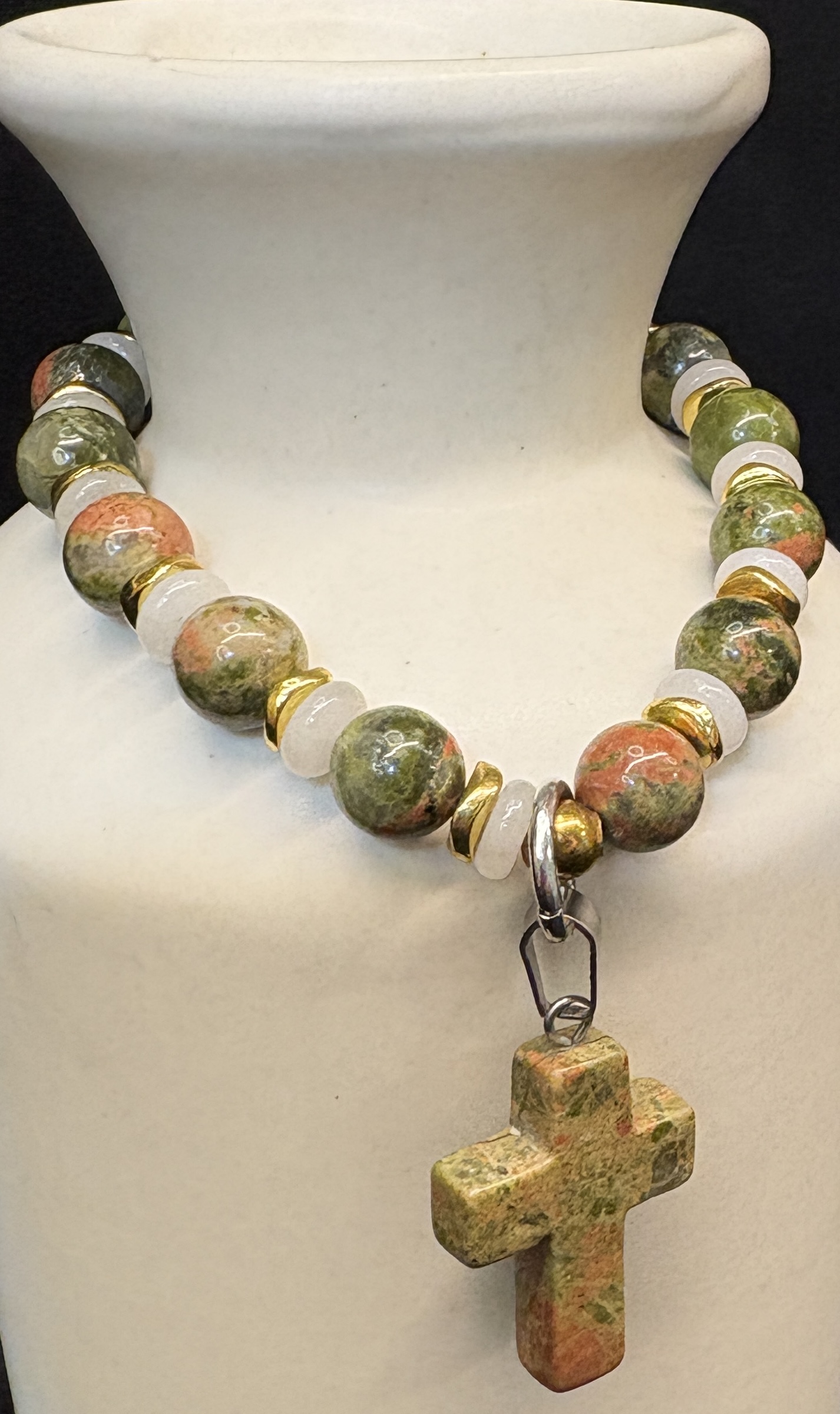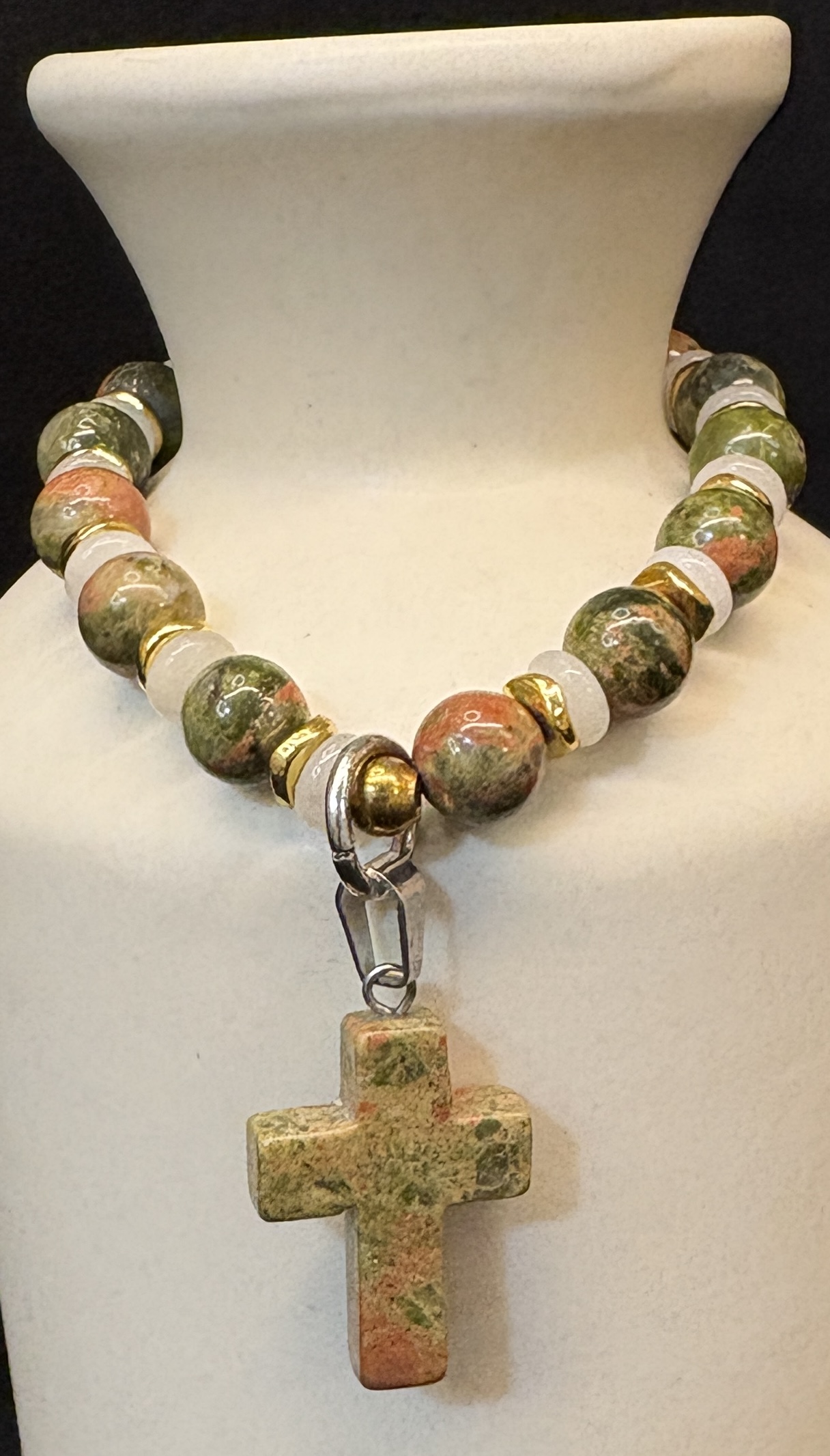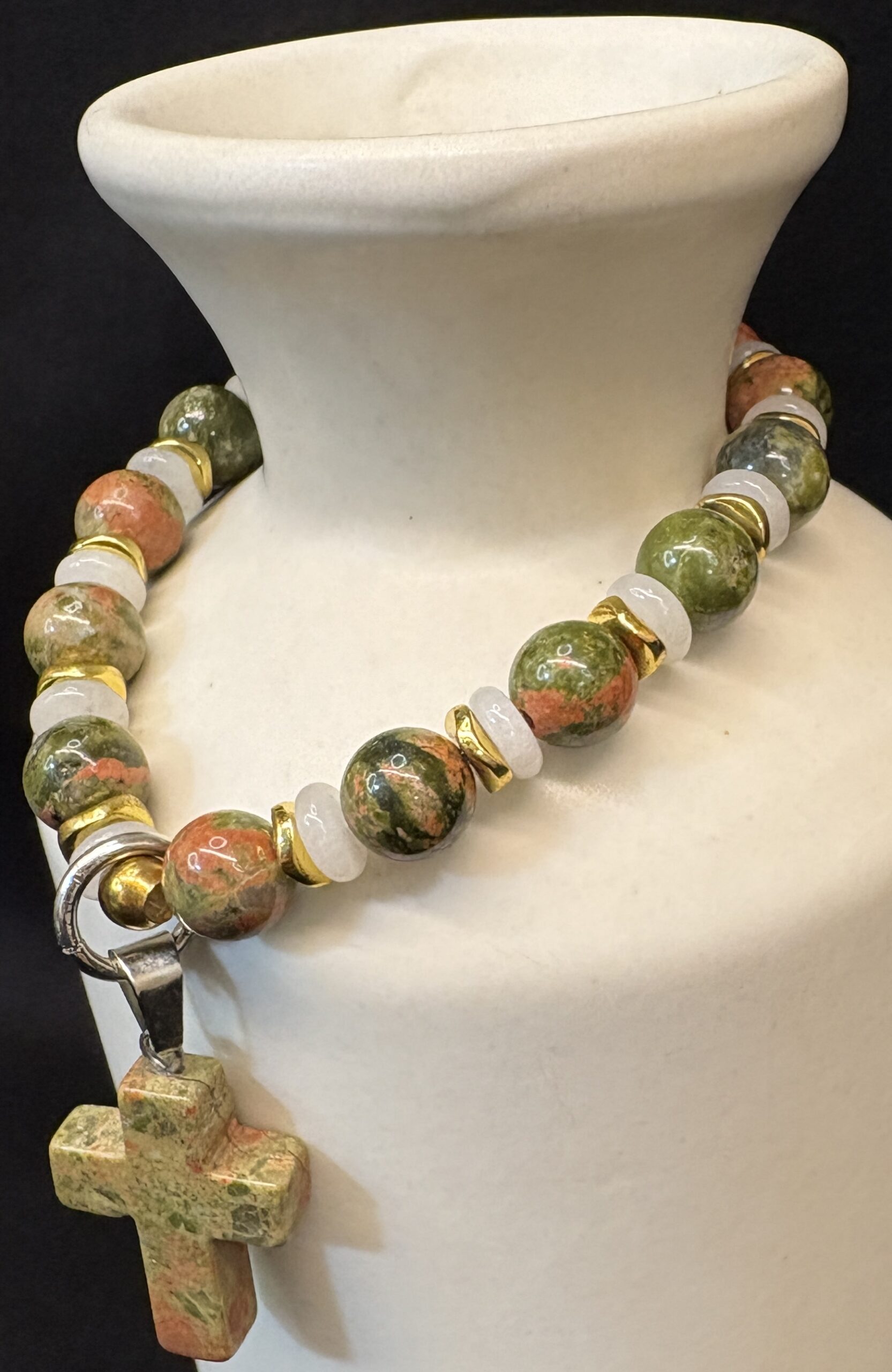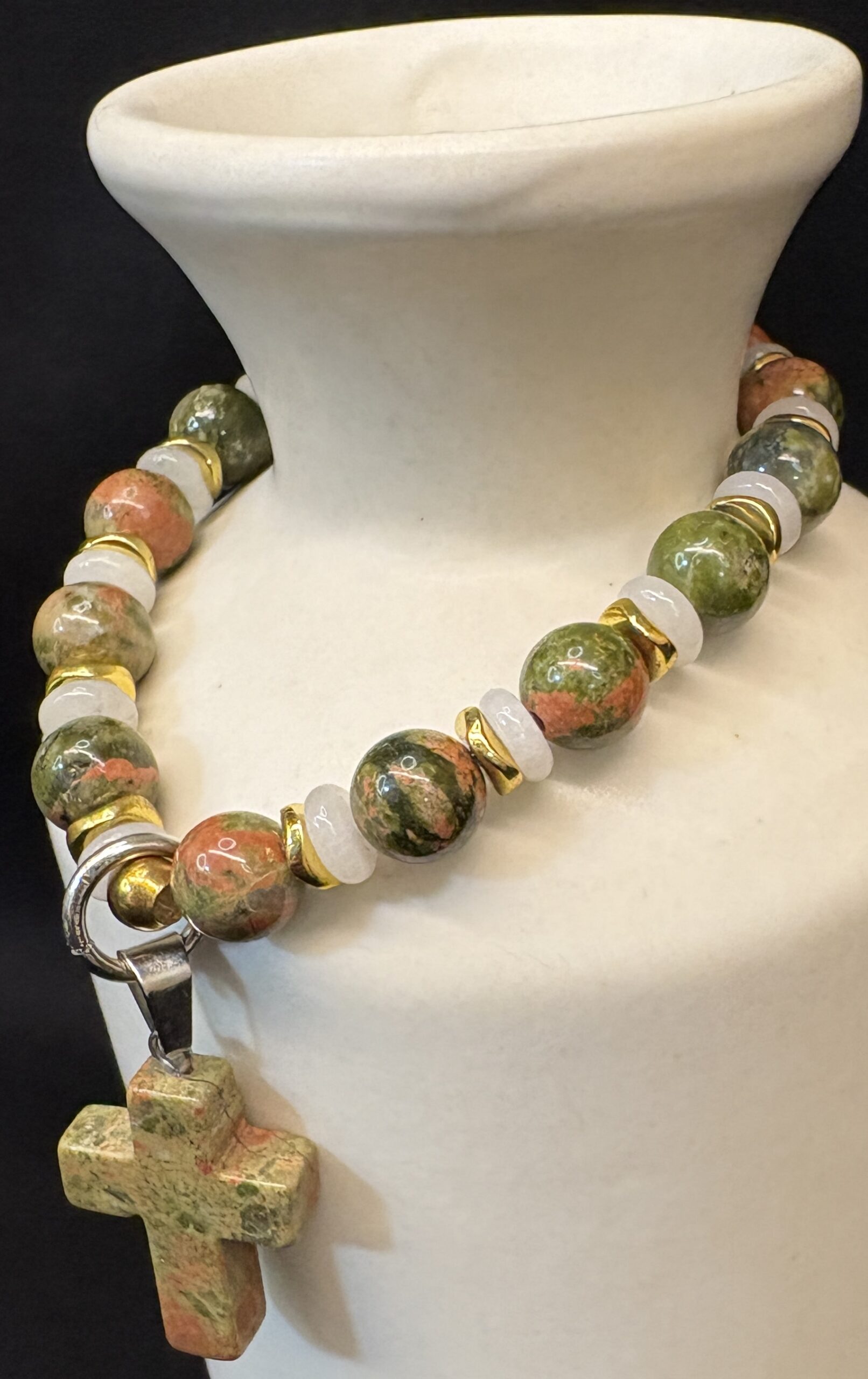 Exquisite handcrafted bracelet, made entirely with genuine natural unakite stones and featuring a delicate unakite cross as its centerpiece. Its soft green and rose hues create a harmonious, elegant design, perfect for daily wear or special occasions.